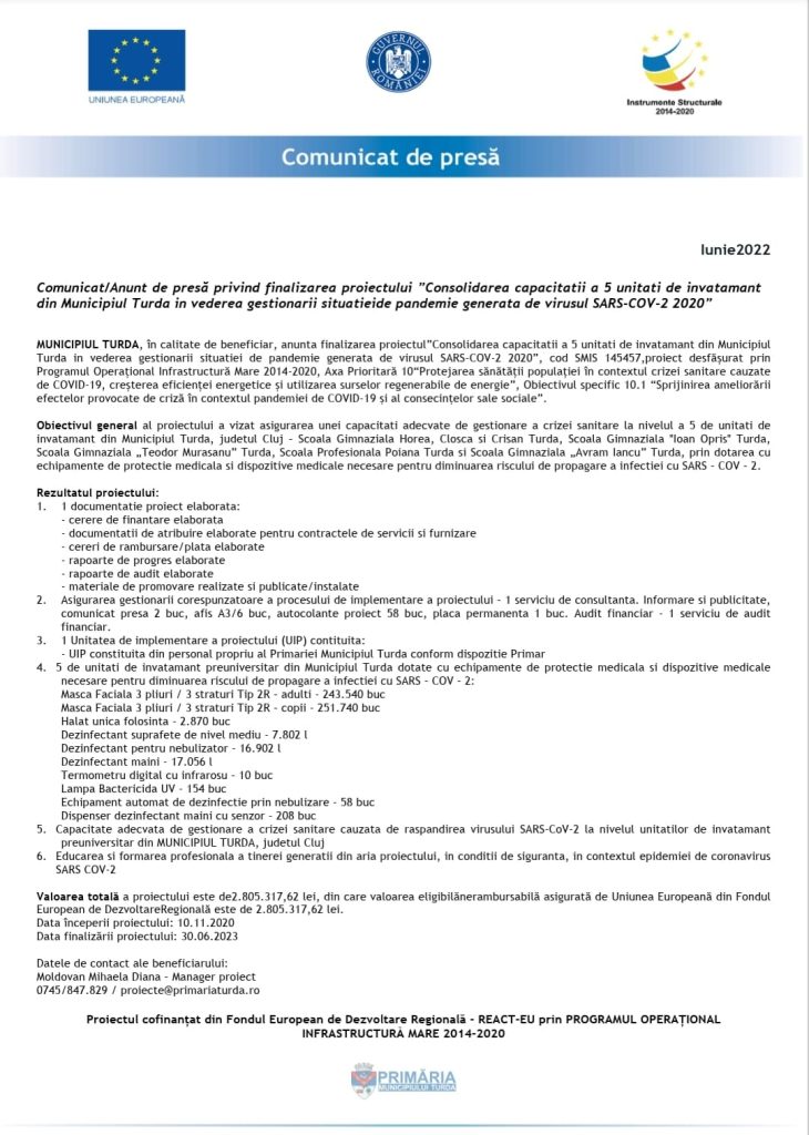 Comunicat/Anunt de presă privind finalizarea proiectului ”Consolidarea capacitatii a 5 unitati de invatamant din Municipiul Turda in vederea gestionarii situatieide pandemie generata de virusul SARS-COV-2 2020”