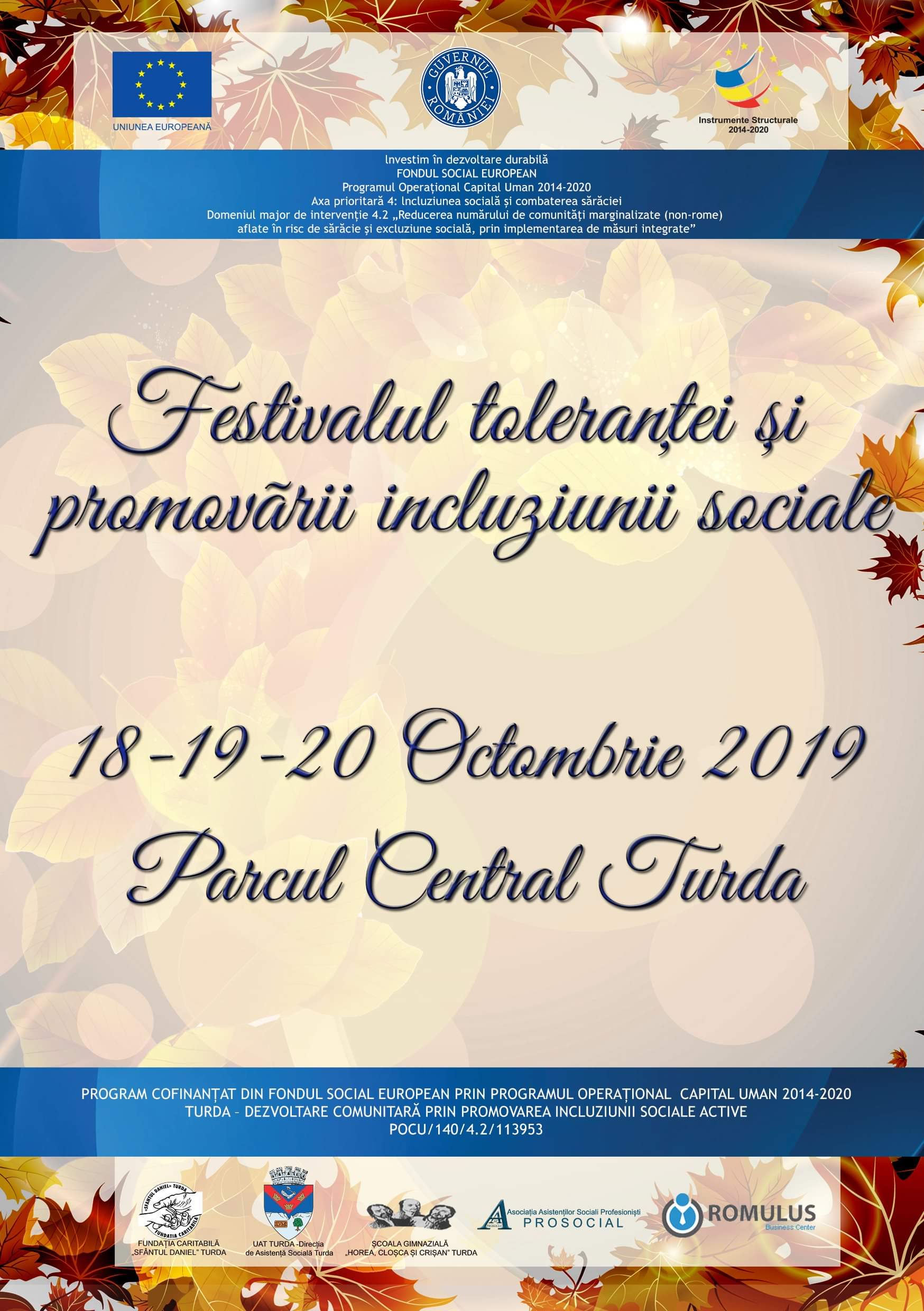 Fundația Caritabilă„Sfântul Daniel” Turda, înparteneriat cu UAT Municipiul Turda – Direcția de Asistență Socială, Școala Gimnazială ”Horea, Cloșca și Crișan” Turda, Asociația Asistenților Sociali Profesioniști ”Pro Social” Cluj și Centrul pentru Afaceri Solidare SRL București va invită în perioada 18 – 20 octombrie 2019 la Săptămâna Incluziunii Sociale și a Toleranței 2019, eveniment ce se va desfășura în Municipiul Turda.