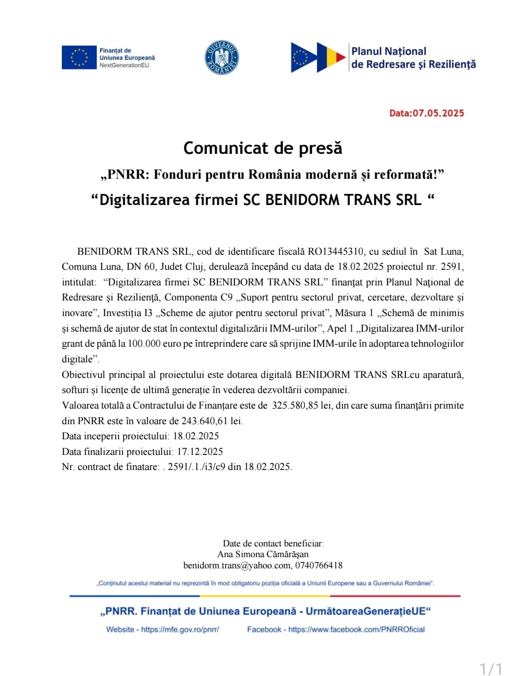 BENIDORM TRANS SRL, cod de identificare fiscală RO13445310, cu sediul în Sat Luna, Comuna Luna, DN 60, Judet Cluj, derulează începând cu data de 18.02.2025 proiectul nr. 2591, intitulat: “Digitalizarea firmei SC BENIDORM TRANS SRL” finanţat prin Planul Naţional de Redresare şi Rezilienţă, Componenta C9 „Suport pentru sectorul privat, cercetare, dezvoltare și inovare”, Investiția I3 „Scheme de ajutor pentru sectorul privat”, Măsura 1 „Schemă de minimis și schemă de ajutor de stat în contextul digitalizării IMM-urilor”, Apel 1 „Digitalizarea IMM-urilor grant de până la 100.000 euro pe întreprindere care să sprijine IMM-urile în adoptarea tehnologiilor digitale”.