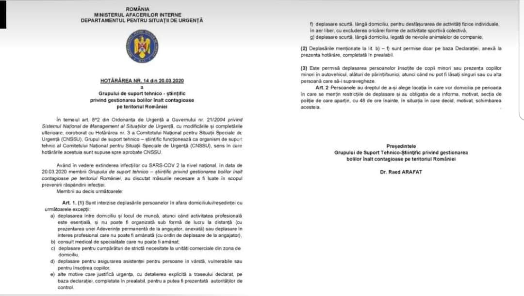 Având în vedere faptul că a fost dat publicității un document al Grupului de suport tehnico-științific privind gestionarea bolilor înalt contagioase pe teritoriul României, intitulat „HOTĂRÂREA NR. 14 din 20.03.2020”