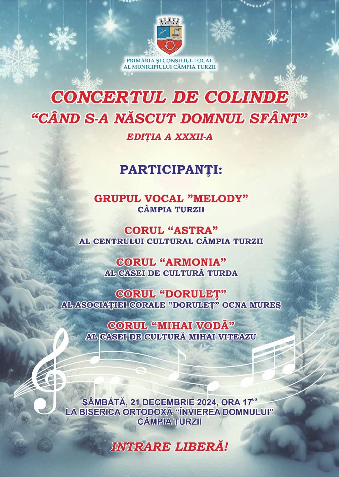 Primăria și Consiliul Local al Municipiului Câmpia Turzii vă invită sâmbătă, 21 decembrie 2024, ora 17:00, la Biserica Ortodoxă „Învierea Domnului” din centrul municipiului, pentru o seară de neuitat, plină de emoție și bucurie sufletească.