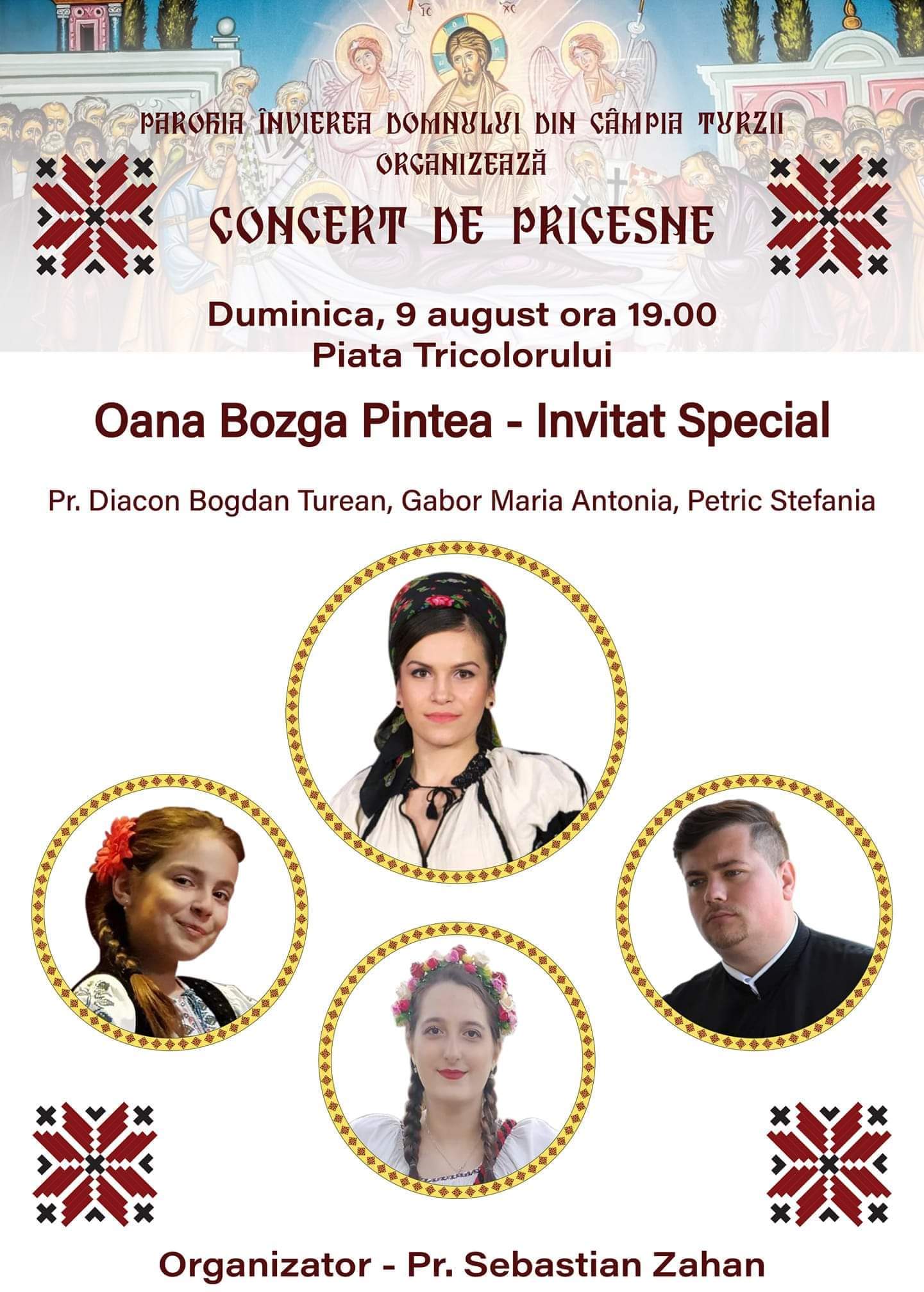 Parohia ortodoxă Învierea Domnului din Câmpia Turzii organizează duminică, 9 august începând cu orele 19.00, în Piața Tricolorului, un recital de pricesne închinate Fecioarei Maria. Alături de nume locale ca Bogdan Turean, Antonia Gabor și Ștefania Petric, va onora cu prezenta, îndrăgita interpretă de muzică populară Oana Bozga Pintea.