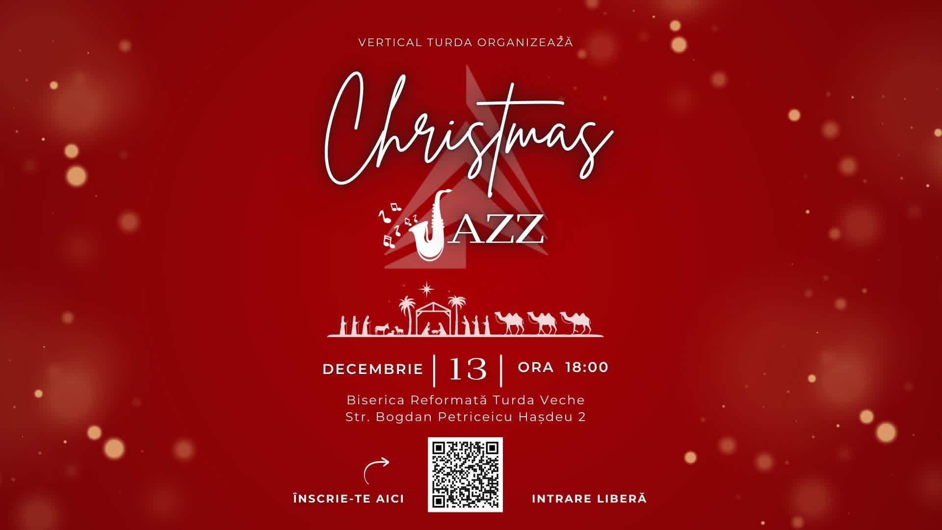 Comunitatea turdeană este invitată Sâmbătă, 13 decembrie, la un eveniment muzical aparte: Christmas Jazz, un concert dedicat atmosferei calde și pline de emoție a sărbătorilor de iarnă. Evenimentul este organizat de Vertical Turda și va avea loc la Biserica Reformată Turda Veche, situată pe strada Bogdan Petriceicu Hașdeu nr. 2, începând cu ora 18:00.