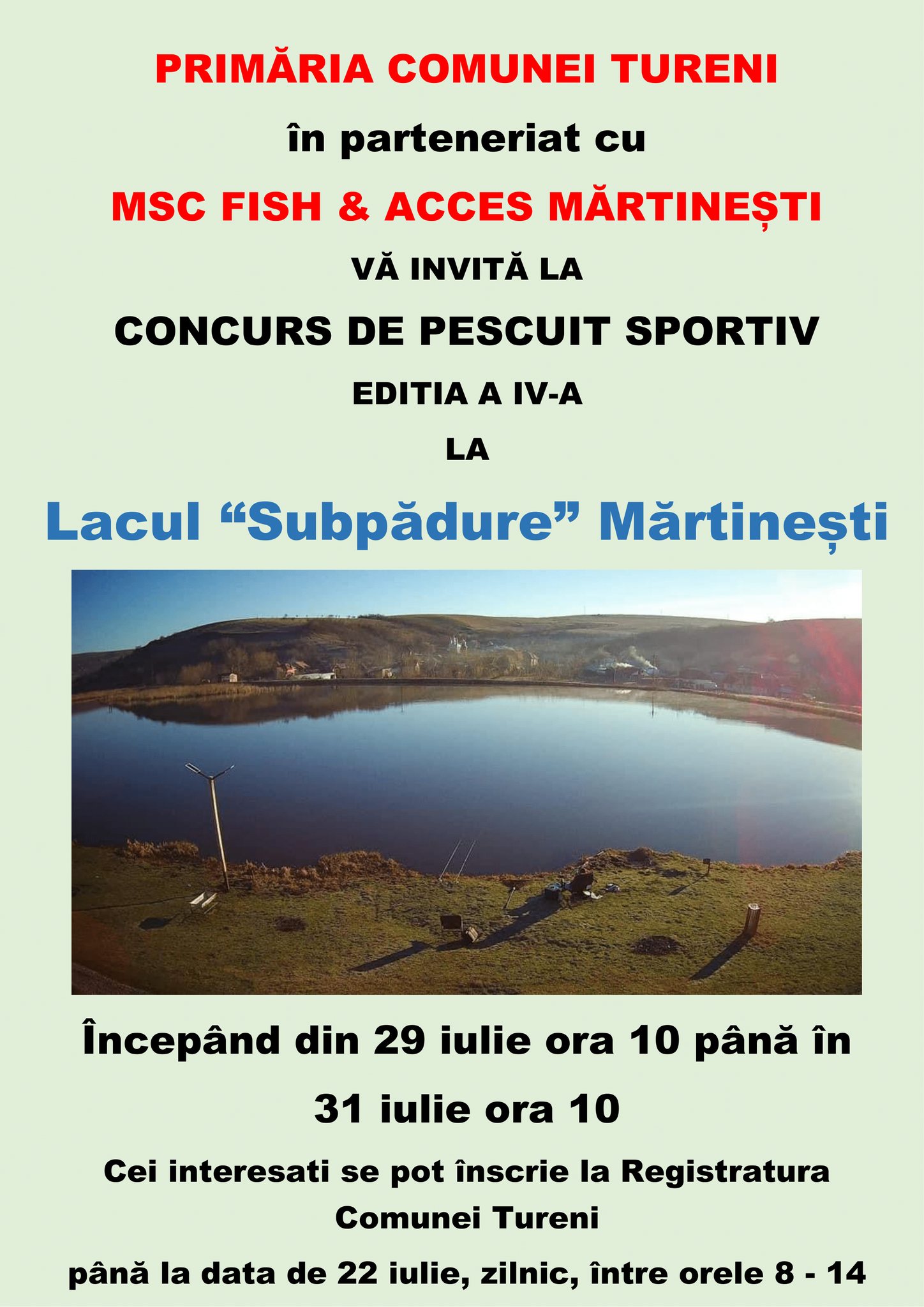 PRIMĂRIA COMUNEI TURENI în parteneriat cu MSC FISH & ACCES MĂRTINEȘTI vă invită să luați parte la un super CONCURS DE PESCUIT SPORTIV