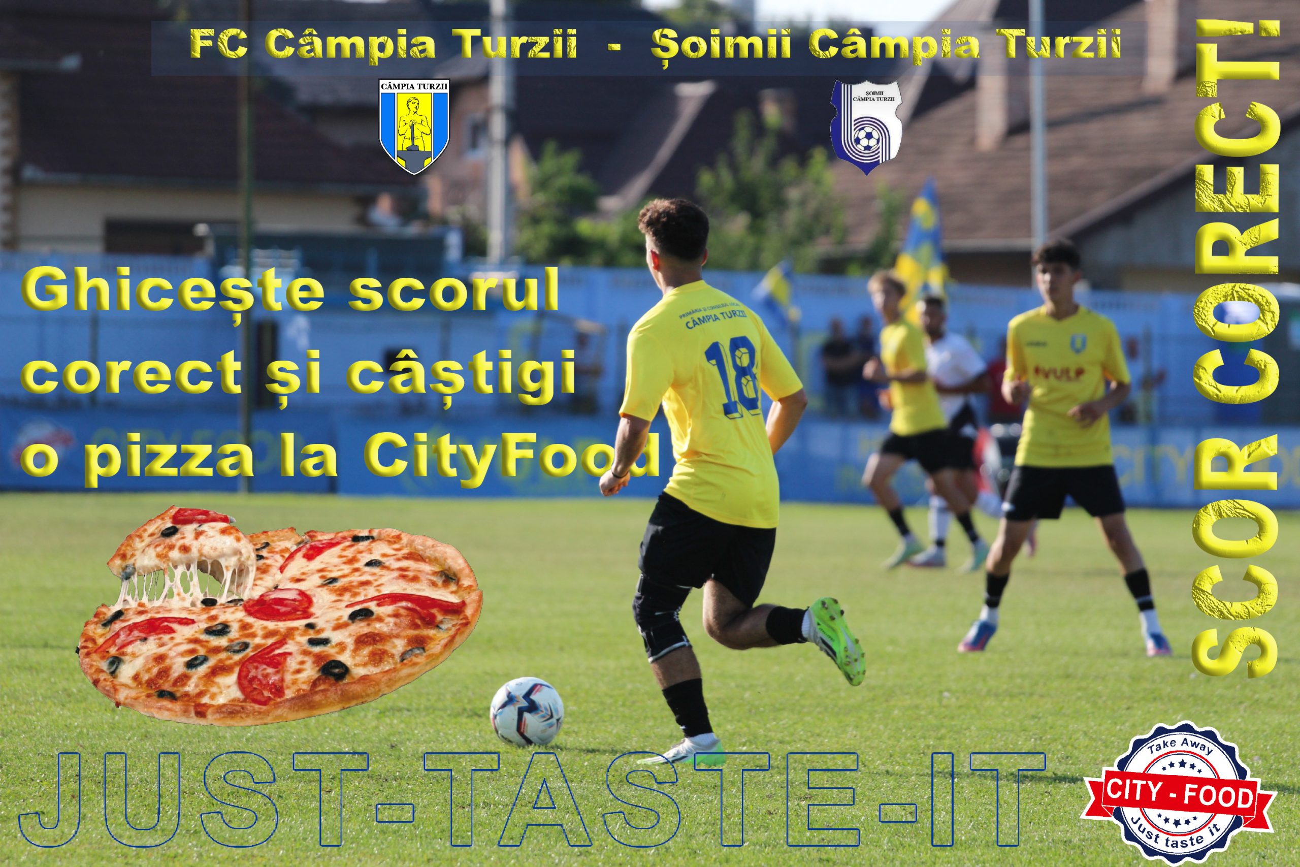Tot ce trebuie făcut este să intrați pe pagina de facebook al CityFood iar în secțiunea de comentarii să ghiciți scorul corect la meciul dintre FC Câmpia Turzii și Șoimii Câmpia Turzii.