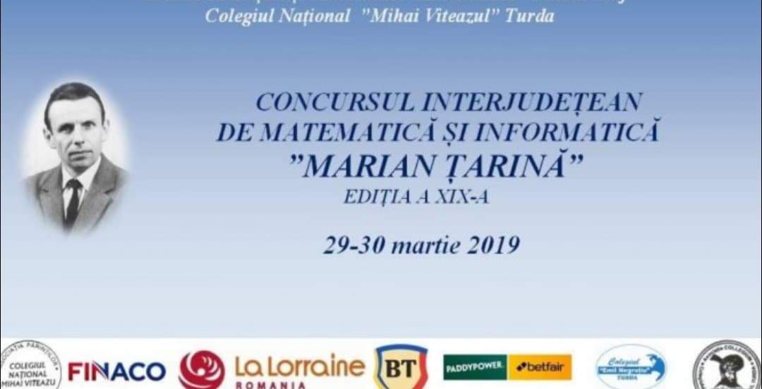 În weekend-ul care tocmai s-a încheiat, Colegiul Naţional “Mihai Viteazul” Turda a fost gazda singurului concurs interjudeţean de matematică şi informatică de acest nivel din judeţul Cluj, Concursul “Marian Ţarină”. Cuprins în lista competiţiilor școlare regionale/interjudețene ce se organizează fără finanțare MEN în anul școlar 2018-2019, prin Ordinul MEN nr. 3061/2019, concursul a reunit 283 de elevi (201 la secţiunea matematică şi 82 la secţiunea informatică) de la clasa a IV-a, până la clasa a XII-a şi peste 40 de profesori din judeţele Alba, Bihor, Bistriţa-Năsăud, Cluj, Maramureş, Mureş şi Sălaj.