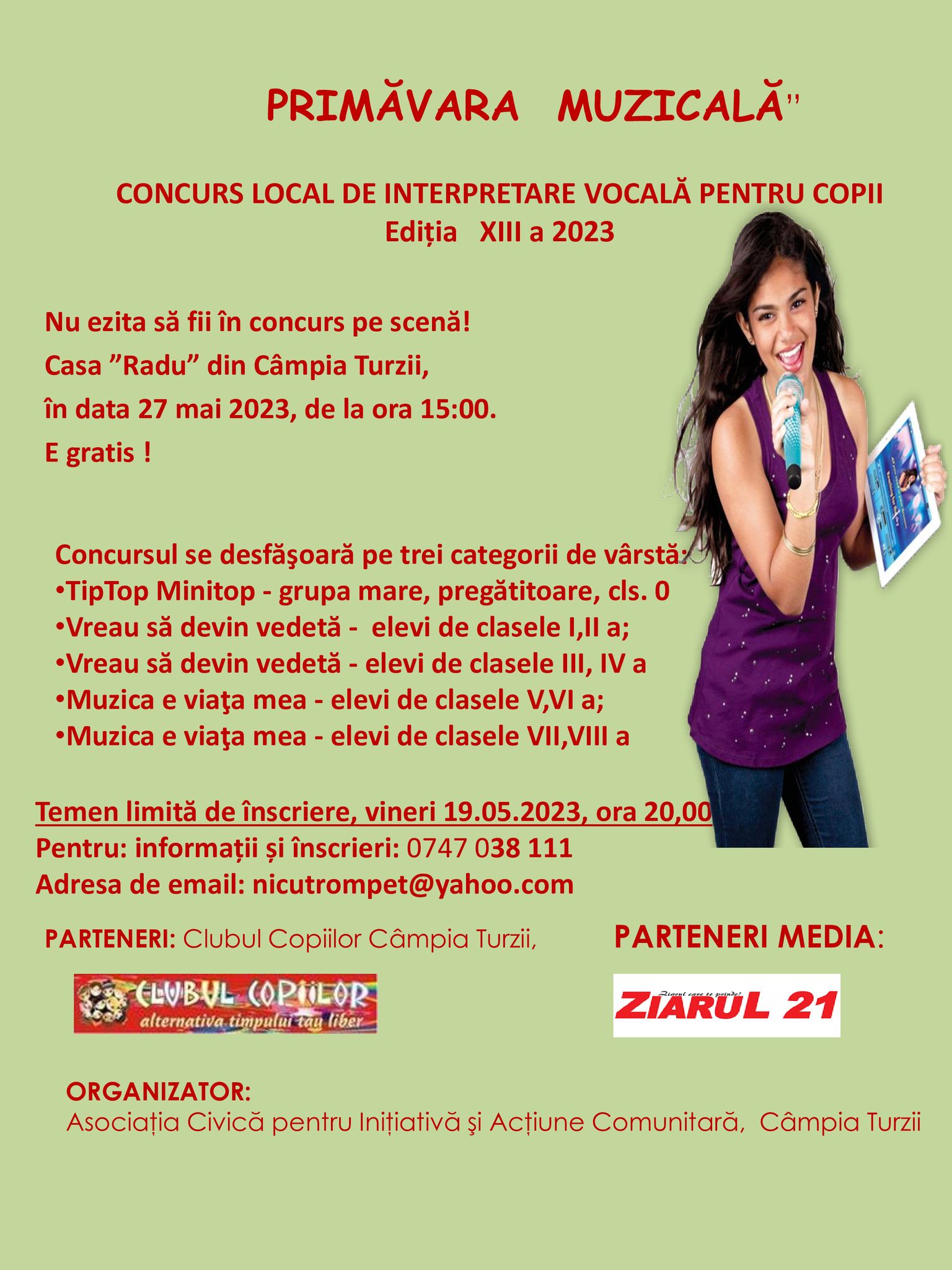 Sâmbătă, 27 mai 2023 de la ora 15, Asociația Civicăpentru Inițiativă și Acțiune Comunitară, organizează la Restaurantul Casa Radu din Câmpia Turzii, ediția XIII a, a Concursului Local de Interpretare Vocală pentru Copii ,,Primăvara Muzicală”.