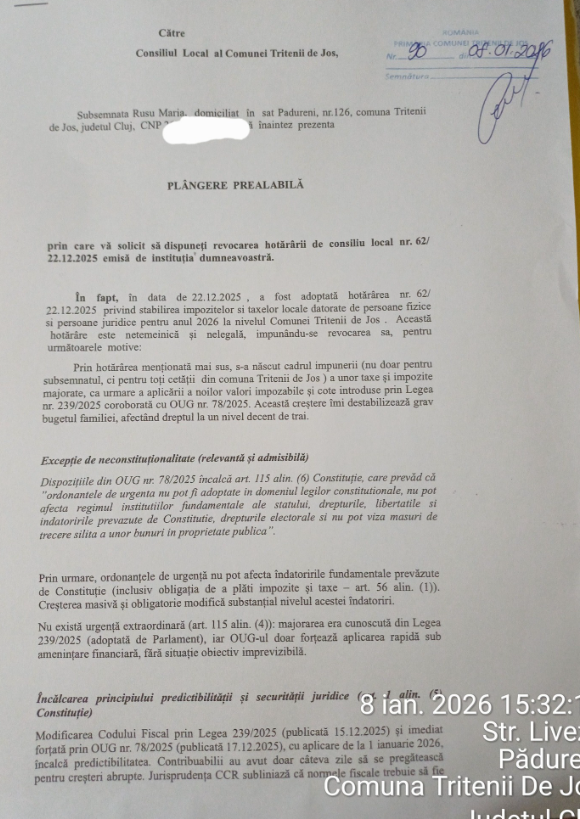 Plângerea prealabilă reprezintă primul pas procedural înaintea unei eventuale acțiuni în instanță, în cazul în care Consiliul Local Tritenii de Jos nu va reveni asupra deciziei de majorare a taxelor și impozitelor locale.