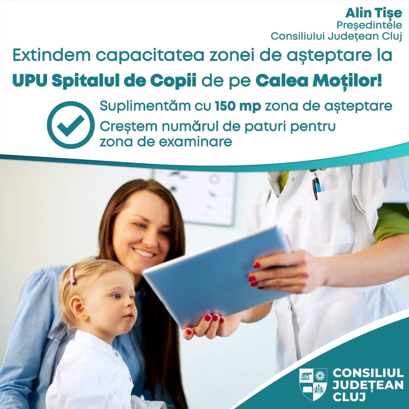 Alin Tișe, președintele Consiliului Județean Cluj: „Până la finalizarea Spitalului Pediatric Monobloc, ne adaptăm și răspundem necesităților actuale. Odată cu realizarea acestui obiectiv vom crește suprafața zonei de așteptare cu aproximativ 70%. Intenția noastră este ca extinderea să fie finalizată și să devină funcțională în maxim șase luni.”