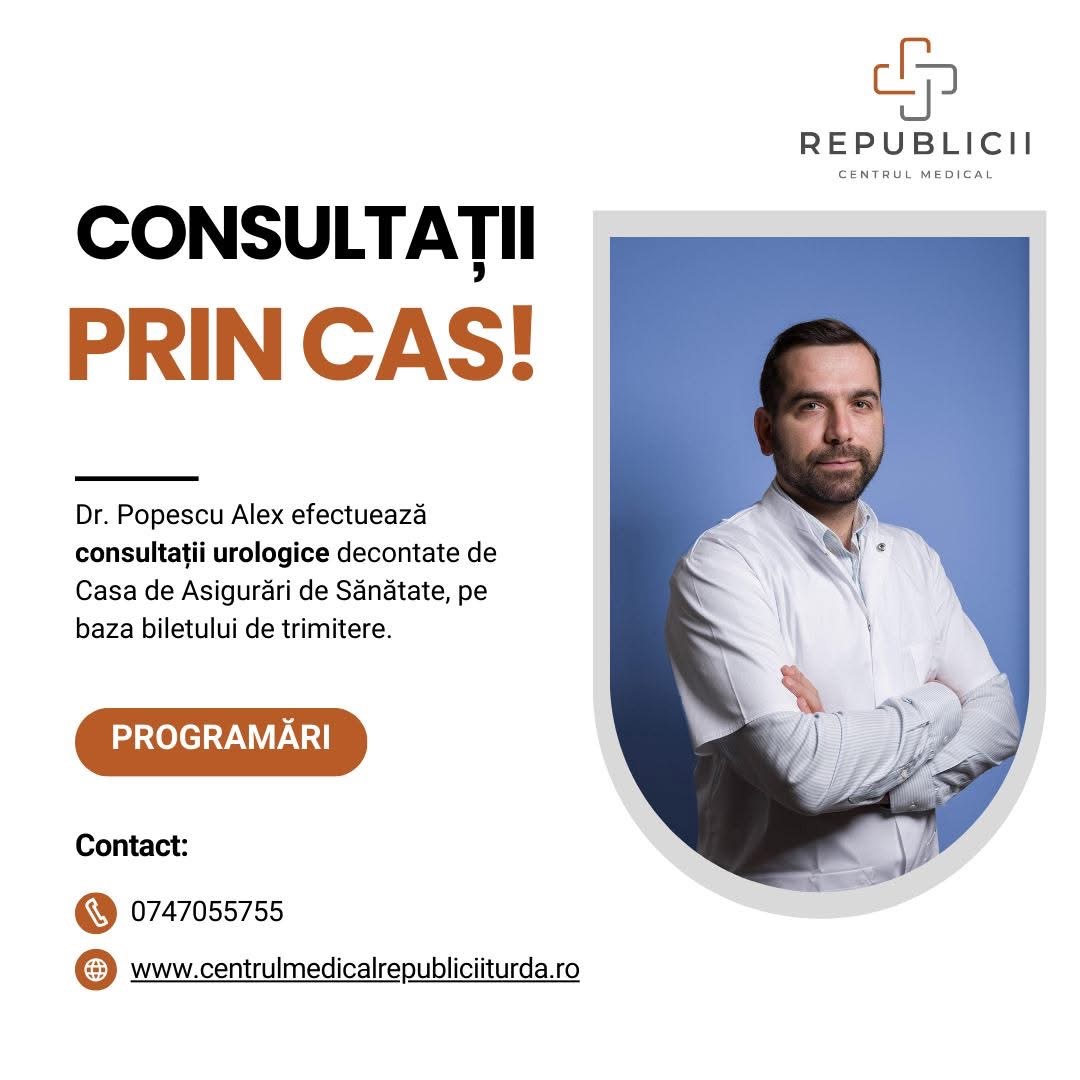 În cadrul specializării de Urologie, Centrul Medical Republicii Turda anunță că Dr. Popescu Alex Otniel, medic specialist urolog, efectuează consultații urologice decontate de Casa de Asigurări de Sănătate, pe baza biletului de trimitere.