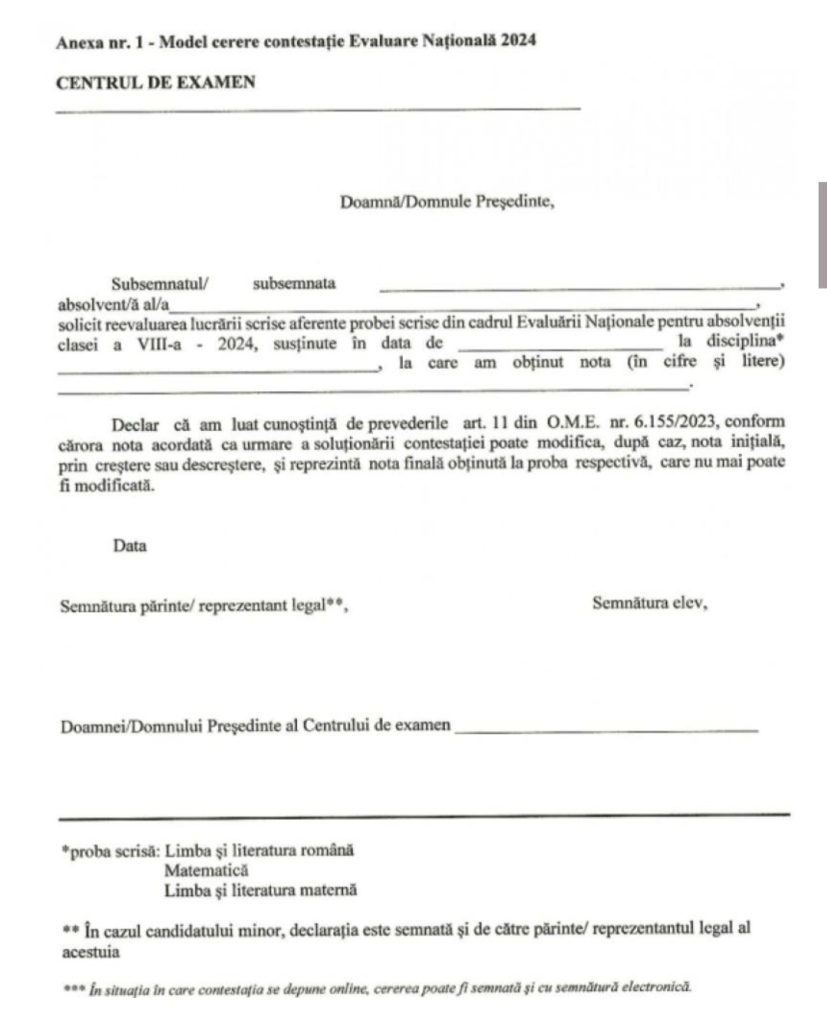 Modelul cererii-tip pentru contestația la Evaluarea Națională 2024