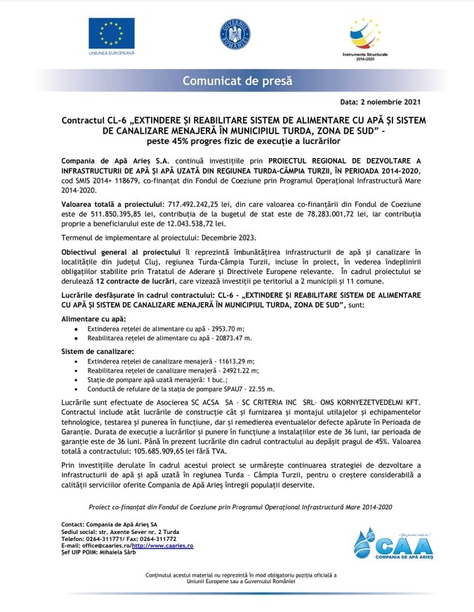 CU APĂ ȘI SISTEM DE CANALIZARE MENAJERĂ ÎN MUNICIPIUL TURDA, ZONA DE SUD”, sunt: