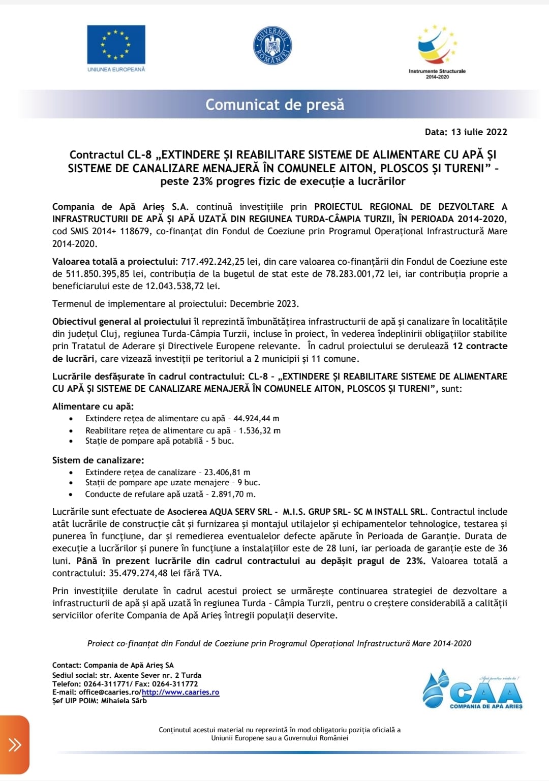 CU APĂ ȘI SISTEME DE CANALIZARE MENAJERĂ ÎN COMUNELE AITON, PLOSCOS ȘI TURENI”, sunt: