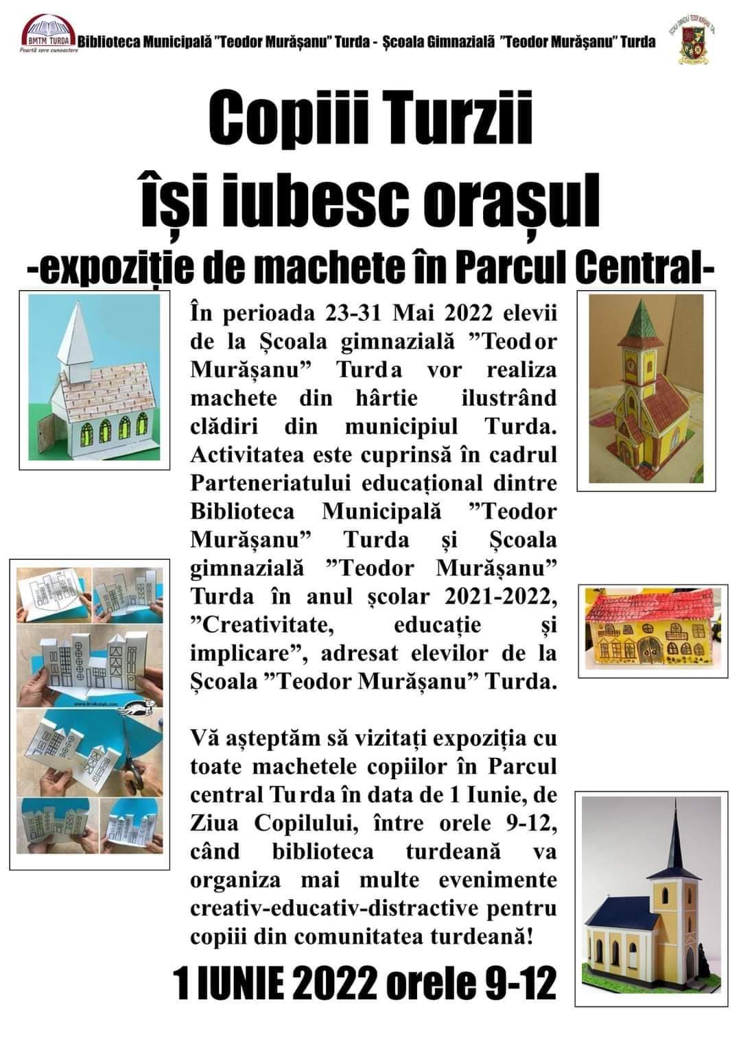 Vă așteptăm să vizitați expoziția cu toate machetele copiilor în Parcul central Turda în data de 1 Iunie, de Ziua Copilului, între orele 9-12, când biblioteca turdeană va organiza mai multe evenimente creativ-educativ-distractive pentru copiii din comunitatea turdeană!