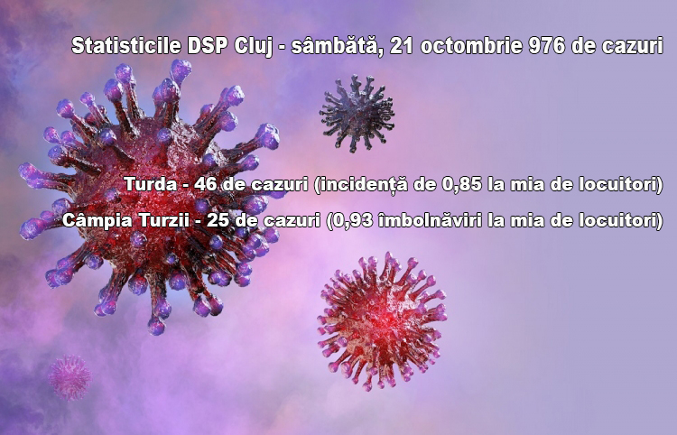 Astfel, potrivit statisticilor DSP Cluj, sâmbătă, 21 octombrie, existau raportate 976 de cazuri de îmbolnăviri. Dintre acestea, la Turda s-au consemnat 46 de cazuri (incidență de 0,85 la mia de locuitori). Cu 25 de îmbolnăviri, Câmpia Turzii a înregistrat, în a doua jumătate a lunii octombrie, 0,93 îmbolnăviri la mia de locuitori.