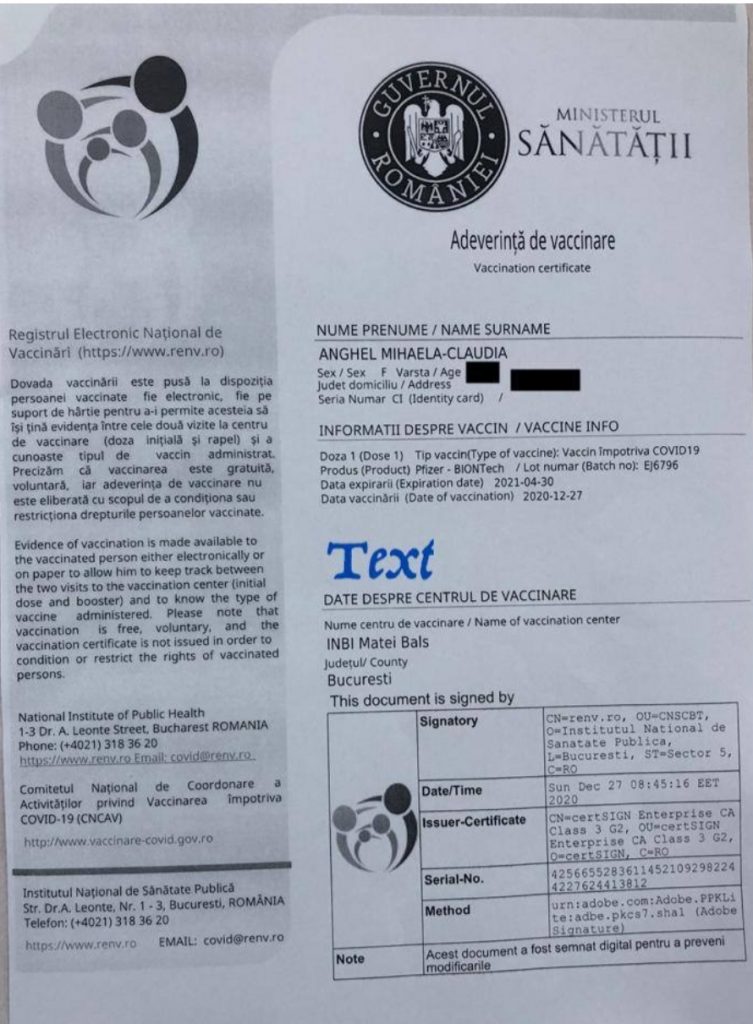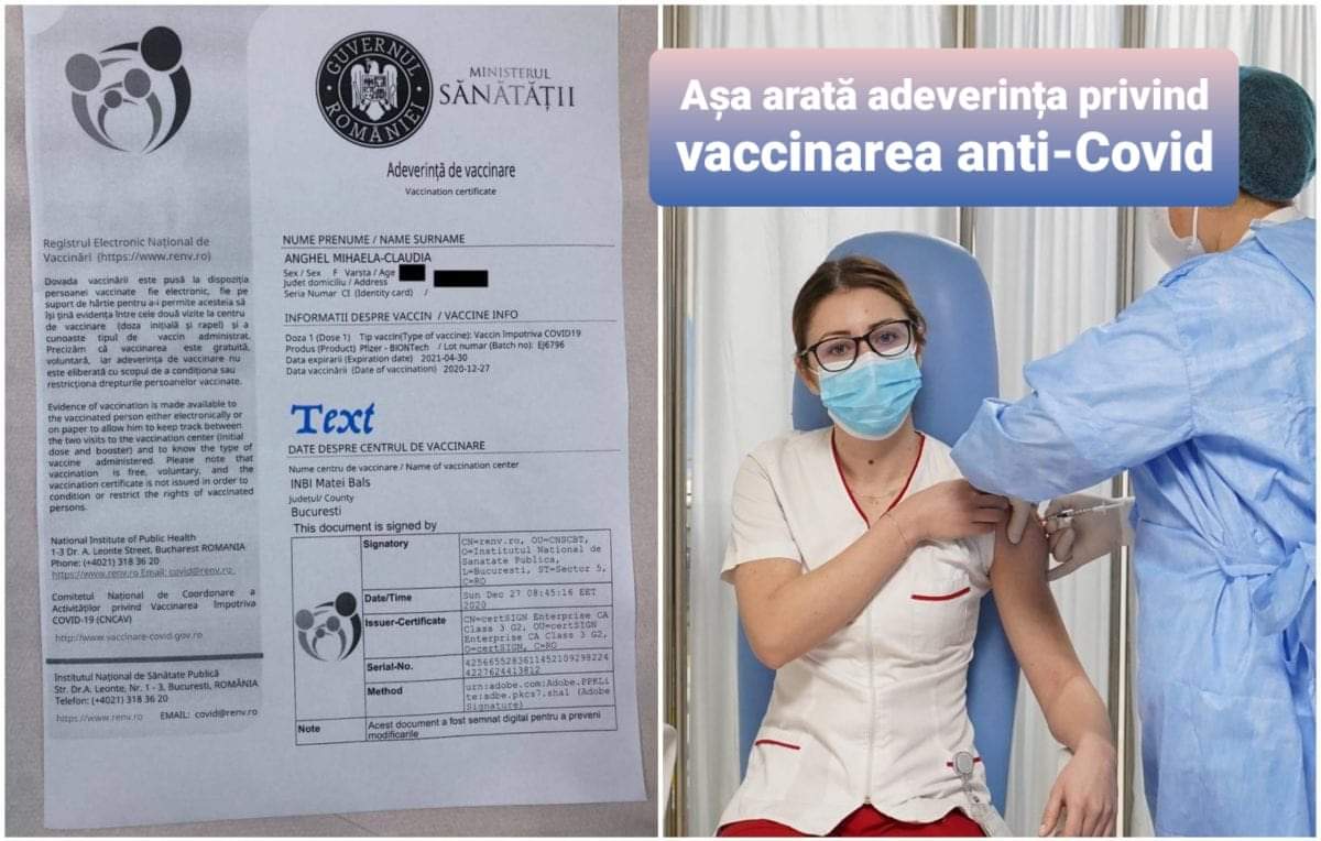 Vaccinarea împotriva noului coronavirus a început duminică în România, primele persoane beneficiare fiind cadrele medicale din toate cele 10 spitale de boli infecţioase aflate în prima linie din luna martie. Imediat după ce îi este administrat serul, fiecare persoană primește o adeverință medicală doveditoare.
