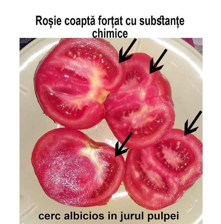 De asemenea trebuie tinut cont de faptul ca rosia adevărata nu trebuie sa fie ca piatra sau sa aibă coaja tare. Uitați-va la cotor, sa nu fie dur. Culoarea sa fie de un rosu deschis, nu spre maroniu. La taiere, produsul trebuie sa fie zemos. Gustul natural e dulce-acrișor. Rosiile crescute accelerat nu au acel miros specific de gradina.