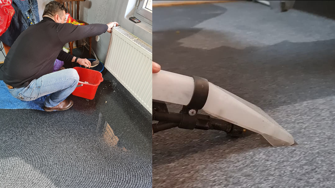 Și-au instalat aparatele, și s-au apucat de lucru. Trageau apa din mochetă văzând cu ochii. Au repetat procedura până în momentul în care mocheta nu a mai avut apă în ea. Pe mochetă erau și niște pete de cafea, (neglijență) însă cu ajutorul soluțiilor folosite, petele au dispărut.