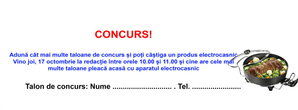 Premiul săptămânii 14-20 octombrie este o tigaie electrică. Adună cât mai multe taloane de concurs de pe prima pagină a Ziarului 21 și vino joi, 17 octombie la redacția ziarului între orele 10.00 și 11.00 și poți pleca acasă cu premiul!