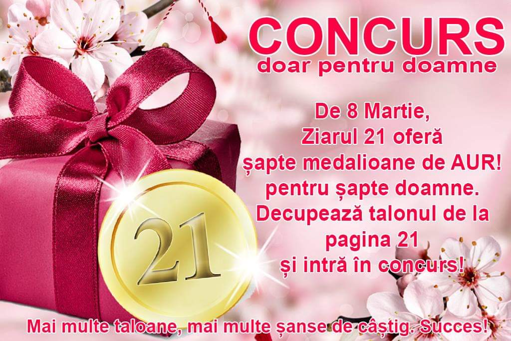 Așa cum și-a obișnuit cititorii, Ziarul 21 nu lasă niciun eveniment important să treacă fără a-și premia cititorii. Astfel, 8 martie, Ziua Intenațională a Femeii va aduce pentru șapte dintre cititoarele noastre câte un medalion din aur. Tot ce trebuie făcut este să decupați talonul de concurs de la pagina 21 și depus la punctele de colectare a presei în urnele „21”. Tragerea la sorți va avea loc vineri, 1 martie, la sediul Ziarului 21 din Turda, strada Mihai Eminescu nr. 6-8, numele câștigătoarelor vor apare în ediția de luni, 4 martie, iar premierea va avea loc vineri, 8 martie, la sediul Ziarului 21. Concursul este dedicat doar doamnelor.