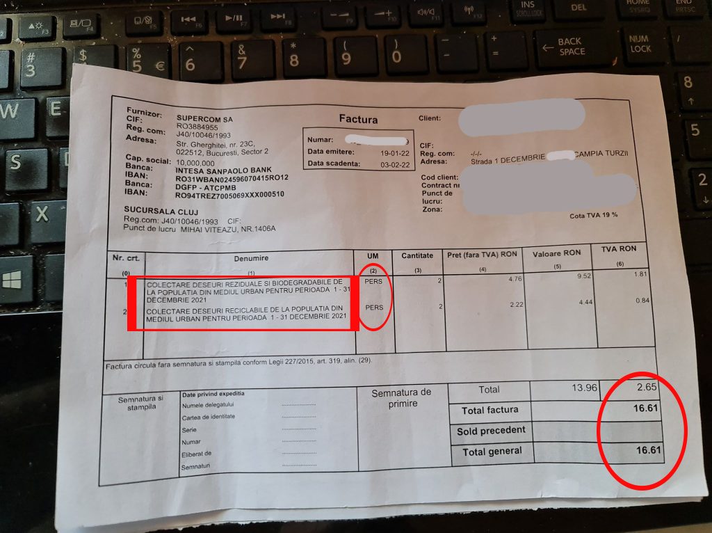 Cu alte cuvinte, valoarea facturilor emise de SUPERCOM SA pentru serviciile prestate în perioada iunie – decembrie 2021 a fost stabilită prin aplicarea tarifului aferent exprimat în [lei/persoană/lună] la numărul de persoane declarat în contractul încheiat cu SUPERCOM SA, iar facturile mari din ianuarie 2022 până în prezent se datorează faptului sunt facturate per kilogram.