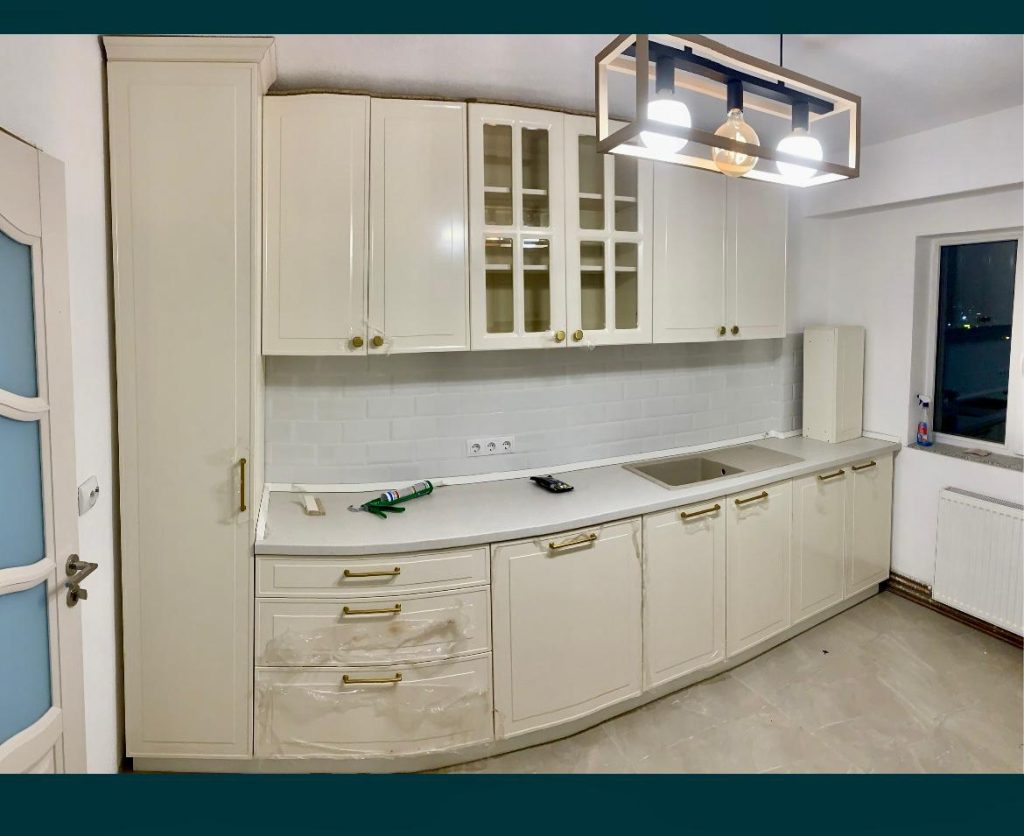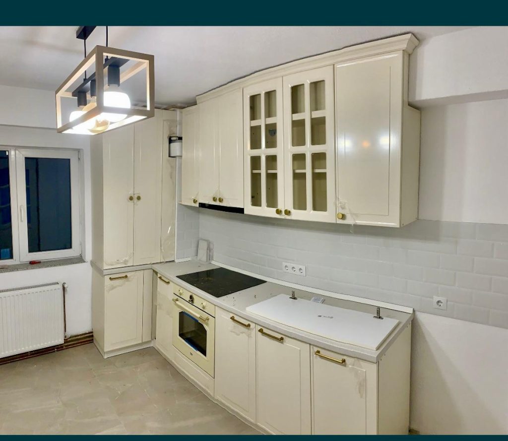 Bucătărie renovată complet și recent. Instalație electrică nouă din cupru pe circuite separate, pentru fiecare electocasnic în parte. Tavan din rigips, decorativă bob de orez zugrăvit în alb, mobila de bucătărie făcută la comandă cu uși din MDF și utilată cu mașină de spălat vase Bosch, plita pe inducție Samsung, cuptor electric Beko vintage, centrală pe gaz noua Vaillant plus toate țevile de încălzire din apartament noi din cupru. Gresie nouă, plăci mari.
