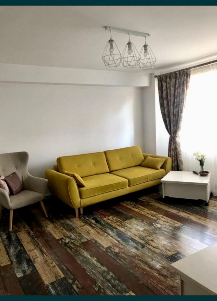 Living spațios cu parchet model vintage, mobilă vintage, tavan din rigips și pereți finisati cu glet si lavabilă albă.