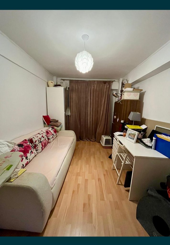 Dormitor 1 cu parchet și lavabilă albă, mobilat complet.