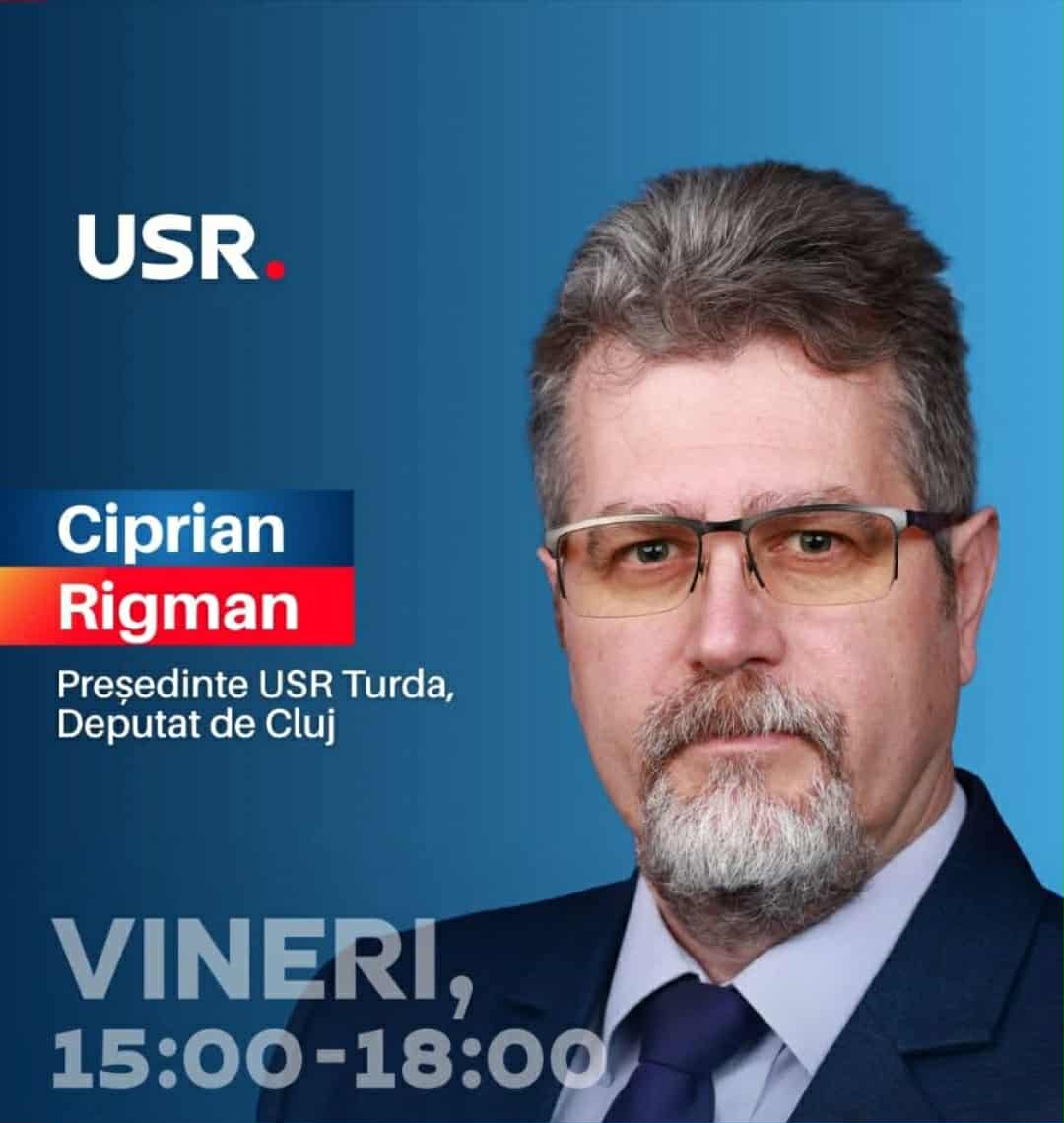 Deputatul Ciprian Rigman își continuă dialogul direct cu cetățenii și îi invită pe turdeni la o nouă rundă de audiențe parlamentare, ce va avea loc vineri, între orele 15:00 și 18:00, la biroul parlamentar din Turda, situat în Piața Republicii nr. 34, lângă Cafeneaua Corso.