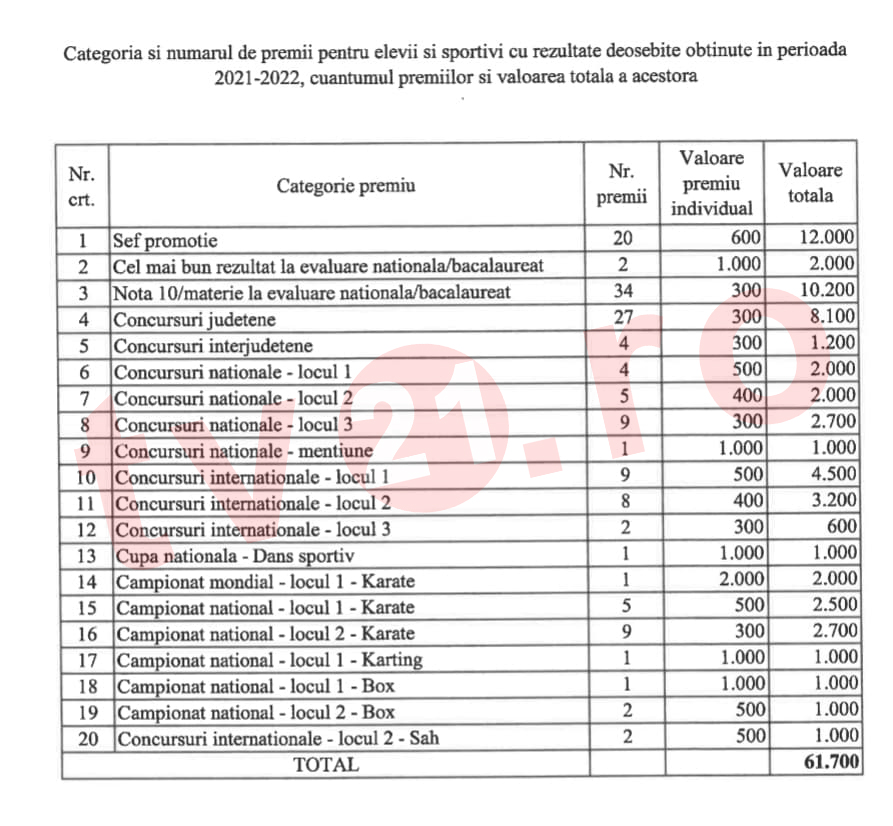 Categoriile de premii gândite de adminitrația turdeană și cuantumul lor sunt în tabelul următor: