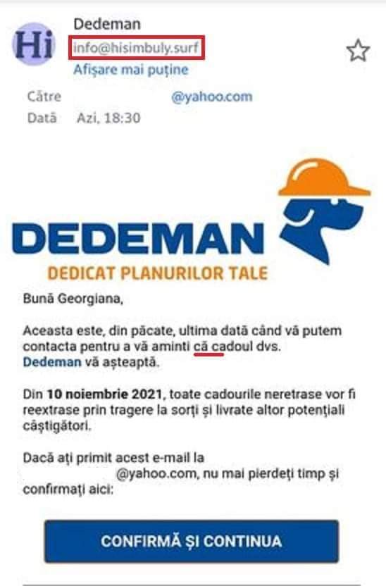 În cazul prezentat în imagine, atacatorii copiază identitatea de brand DEDEMAN pentru a convinge potențialele victime că este vorba despre o inițiativă legitimă, însă dacă suntem atenți la adresa de pe care sosește acel mail, putem observa cu ușurință că este una neoficială și fără nicio legătură cu compania, de pe un domeniu .surf.