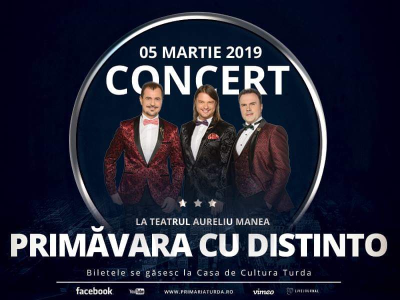 Primăvara începe cu trupa de pop-opera DISTINTO care va susține un concert la Turda în data de 5 martie de la ora 19,00 la Teatrul „Aureliu Manea”. Întregul evantai de emoții care răsar în suflete în fiecare primăvară se regăsesc în repertoriul minunat pe care DISTINTO îl va interpreta cu …distincția ce îi definește pe cei trei tenori.