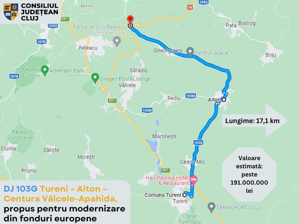 Consiliul Județean Cluj a aprobat miercuri, 26 aprilie a.c, proiectul de hotărâre inițiat de președintele Alin Tișe, referitor la aprobarea indicatorilor tehnico-economici ai investiției privind modernizarea drumului județean DJ 103G Tureni-Ceanu Mic-Aiton-Gheorghieni-Centura Vâlcele-Apahida, în lungime de 17,1 km.