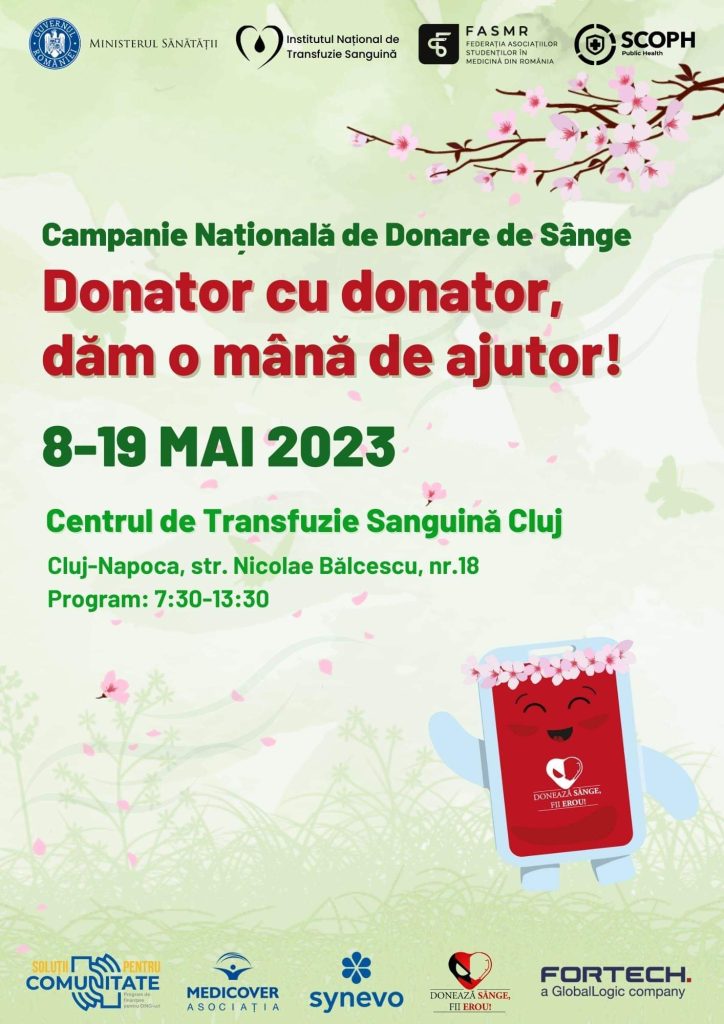 DONATOR CU DONATOR, DĂM O MÂNĂ DE AJUTOR! – campanie națională de donare de sânge Cluj-Napoca, 8-19 Mai 2023