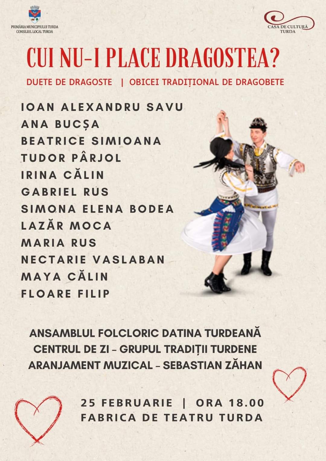 Evenimentul „CUI NU-I PLACE DRAGOSTEA?” va include obiceiuri folclorice specifice acestei sărbători străvechi, versuri interpretate, duete muzicale de dragoste și muzică populară interpretată de artiști talentați din Turda și din împrejurimi.