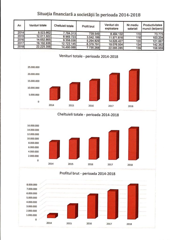 Daca în anul 2014 veniturile totale erau de 8.523.862 de lei, patru ani mai târziu, în anul 2018, acestea au explodat la 22.225.356 lei. Profitul a crescut de la 739.549 la 7.735.268 lei.