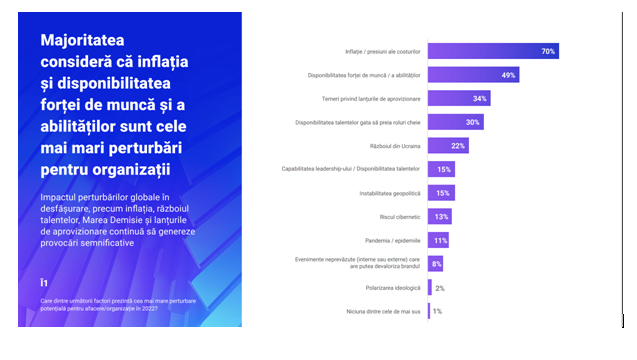 Astfel, pentru companii, cele mai mari îngrijorări sunt, anul acesta: inflația sau creșterea costurilor (70%), disponibilitatea forței de muncă (49%), problemele din lanțul de aprovizionare (34%), disponibilitatea personalului angajat (30%), războiul din Ucraina (22%).