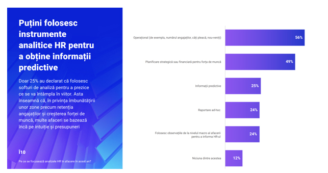 Cu toate că organizațiile încep să devină conștiente de importanța instrumentelor de HR analytics / importanța datelor în departamentul de HR, doar 25% dintrerespondenți spun că organizațiile au adoptat noi tehnologii, precum inteligența artificială, pentru a înțelege ce s-ar putea întâmpla în viitor.