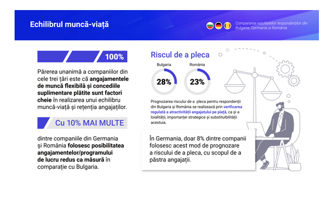 Părerea unanimă a respondențilorromâni, bulgari și germani este că angajamentele de muncă flexibilă și concediile suplimentare plătite sunt factori cheie în realizarea unui echilibru muncă-viață și retenția angajaților, astfel că a crescut cu 10% numărul companiilor din Germania și România care au în vedere reducerea orelor de muncă pentru angajați, spre deosebire de companiile din Bulgaria.