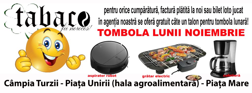 Poți fi și tu unul dintre câștigătorii noștri în luna noiembrie, unde sunt puse în joc o cafetieră, un aspirator robot și un grătar electric. Regulamentul tombolei este unul simplu: la orice cumpărătură de peste 30 de lei sau la fiecare Ziarul 21 cumpărat (3 lei), la orice bilet loto jucat în agenția noastră sau la orice factură plătită la noi (indiferent de valoare) se oferă gratuit câte un talon pentru tombola lunară. Mai multe taloane, mai multe șanse de câștig.