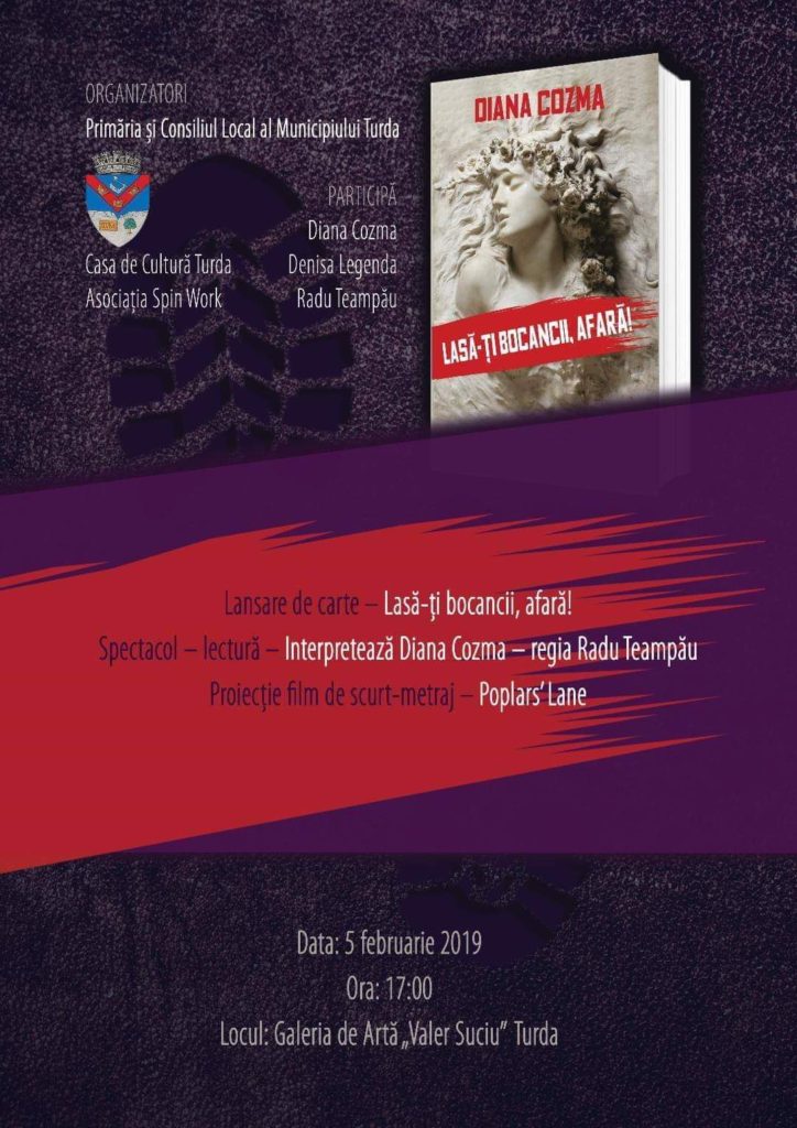 Casa de Cultura Turda vă invită să participați la un eveniment cultural care reunește trei momente ce se înscriu in sfera literaturii și a filmului: lansarea cărții LASĂ-ȚI BOCANCII, AFARĂ! – autor DIANA COZMA, spectacolul- lectură în interpretarea Dianei Cozma, regia Radu Teampău și proiecția filmului de scurt metraj POPLARS’ LANE.