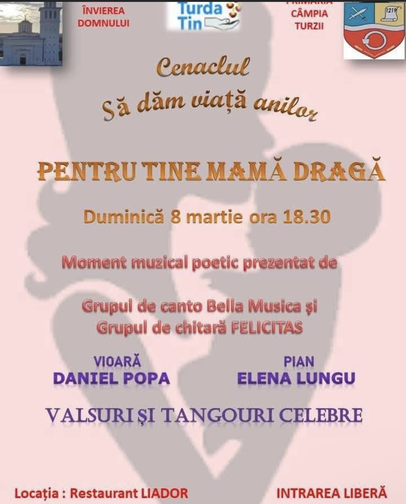 Locuitorii din Câmpia Turzii sunt invitați duminică, 8 martie, începând cu ora 18:30, la un eveniment artistic dedicat mamelor, intitulat „Pentru tine, mamă dragă”. Manifestarea este organizată de Parohia Câmpia Turzii II, în colaborare cu Cenaclul „Să dăm viață anilor”.