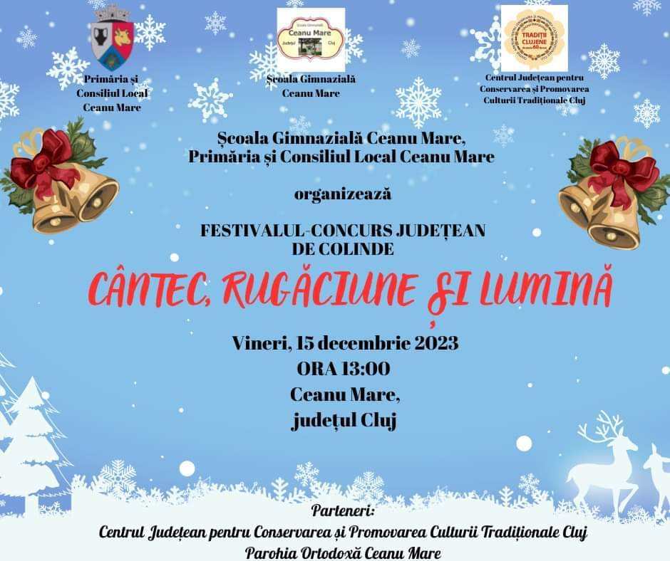 Primăria și Consiliul Local al Comunei Ceanu Mare, în parteneriat cu Centrul Județean pentru Conservarea și Promovarea Culturii Tradiționale Cluj, Școala Gimnazială Ceanu Mare și Parohia Ortodoxă Ceanu Mare au deosebita plăcere de a vă invita la un concert EXTRAORDINAR dedicat Sărbătorii Nașterii Domnului.