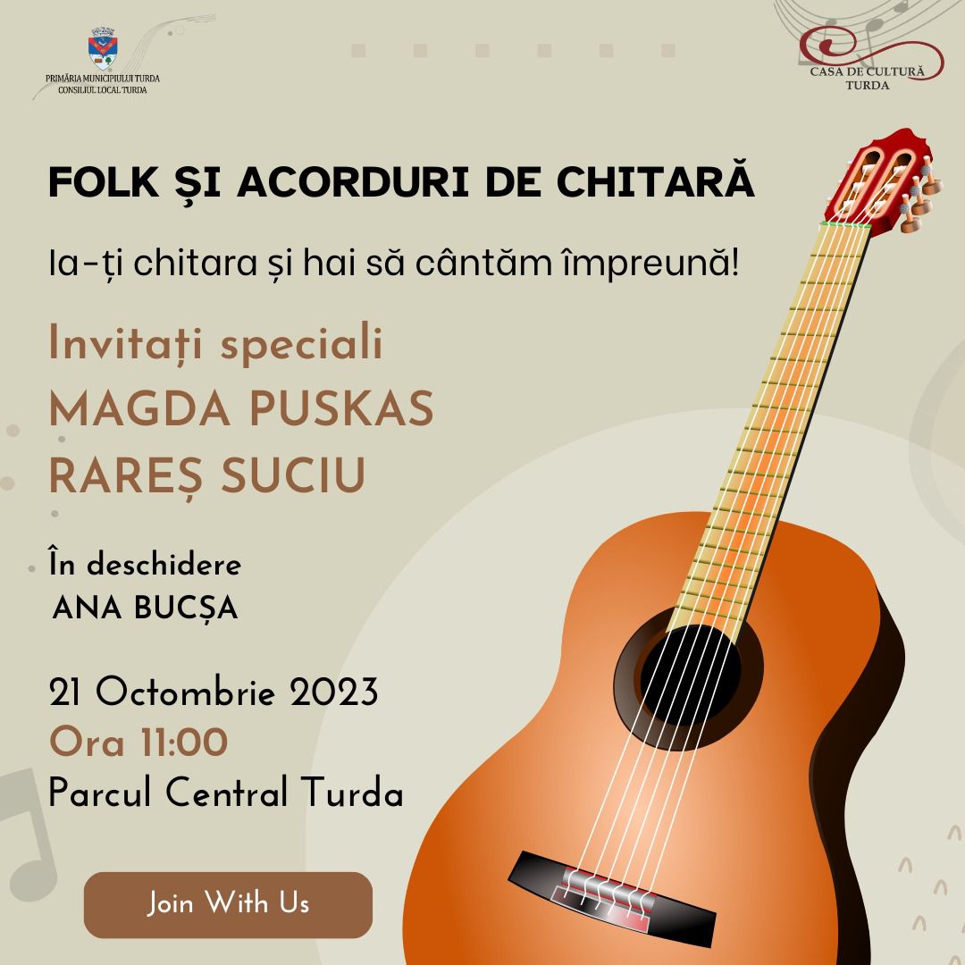Sâmbătă, 21 octombrie 2023, pregătiți chitarele și inima pentru un spectacol de neuitat! Vă invităm cu drag la evenimentul “FOLK ȘI ACORDURI DE CHITARĂ” care va avea loc în Parcul Central din Turda.