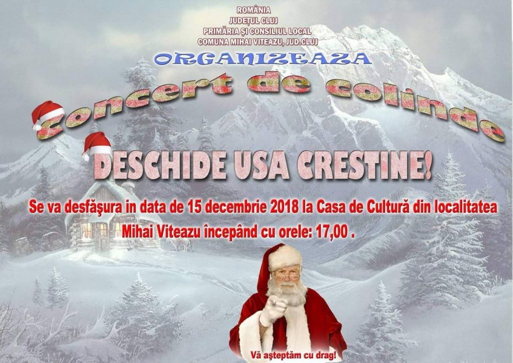 În data de 15 decembrie, cu începere de la ora 17:00, la Casa de Cultură din localitatea Mihai Viteazu, se desfășoară un deosebit concert de colinde susținut de 9 grupuri de colindători care, cu bucurie vin să vestească minunea nașterii domnului Iisus Hristos. Pe lângă femeile voluntare din Luna, Corul Ordotox din Mihai Viteazu, Centrul de Zi Turda, Grupul din Cheia, Colindătorii Rugyek, Grupul Craițele, o să colinde cu mult drag și copiii de la ansamblul Fiii Moților, condus de maestru Cuc. Soliștii ansambului, Ștefan Suciu, Manuela Vitca, Raluca Drule, Gabriel Făgădar, Roxana Bica, Eliza Lazăr, Melisa Cuc și Laura Boboia, sunt pregătiți să uimească audiența.