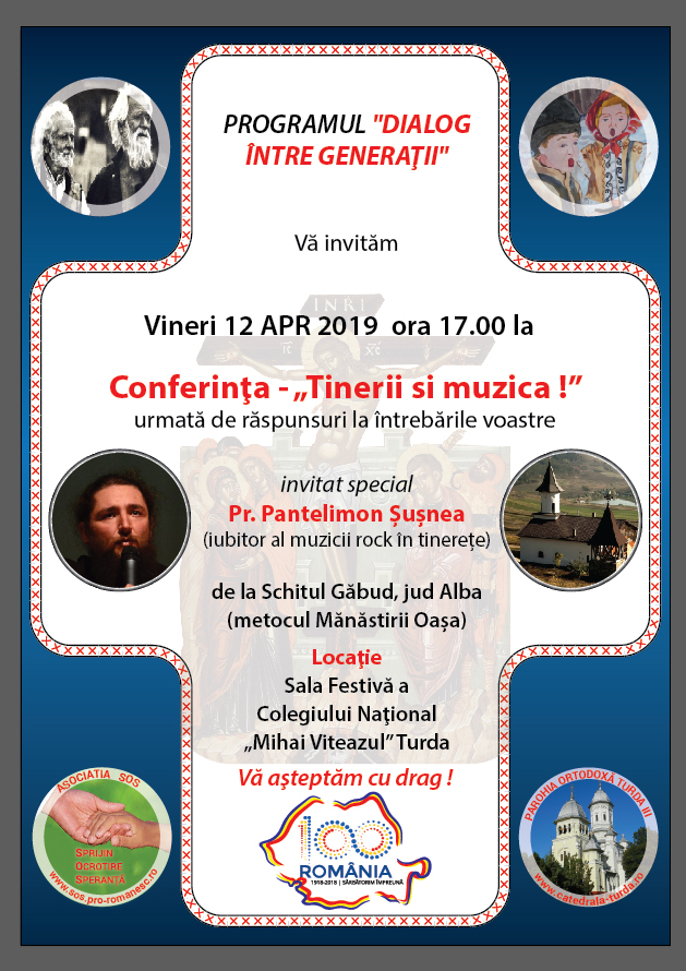 Vă invităm vineri 12 aprilie la ora 17.00 la Conferința „Tinerii și muzica” sustinuta de Pr. Pantelimon Susnea (iubitor a muzicii rock in tinerete) de la Schitul Gabud jud. Alba (metocul Manastirii Oasa). Locatia Sala Festivă a Colegiului Nat. Mihai Viteazul Turda. Sunt așteptați tineri dar și adulți. Părintele organizează la schit și la Man. Oasa multe tabere cu diferite tematici fiind înconjurat mereu de tineri. Vă multumim. Vă așteptăm cu drag. Asociatia S.O.S. și Parohia Ortodoxa Turda 3.