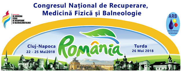 Asociația Română de Balneologie și Societatea Română de Medicină Fizică, de Recuperare și Balneoclimatologie, în parteneriat cu Primăria Municipiului Turda și Salina Turda organizează în intervalul 22 Mai – 26 Mai 2018 la Cluj Napoca și Turda, CONGRESUL NAȚIONAL DE RECUPERARE, MEDICINĂ FIZICĂ ȘI BALNEOLOGIE. Evenimentul dedicat Centenarului Marii Uniri 1918 – 2018 se desfășoară sub auspiciile academice ale Universității de Medicină și Farmacie ″Iuliu Hațieganu″ din Cluj Napoca, ″Carol Davila″ din București și Grigore T. Popa din Iași, cu participare internaționala.