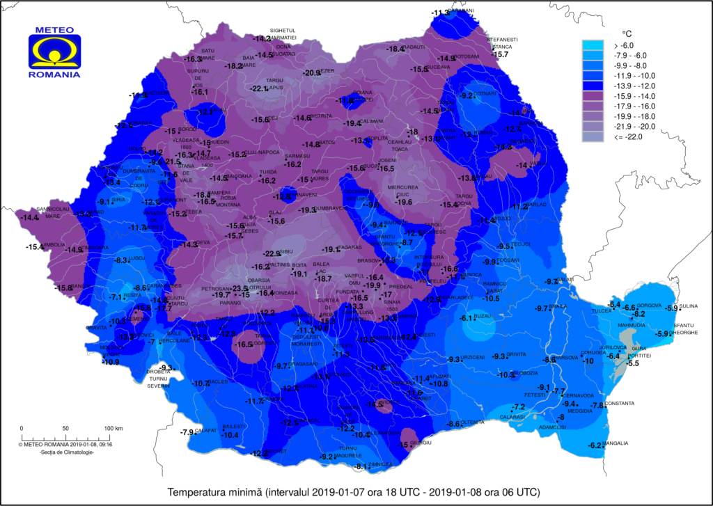 La nivel național în această dimineață s-au înregistrat temperaturi minime de -23,5 grade la Obârșia Lotrului, – 22,9 grade Sibiu, -22,1 grade Târgu Lăpuș, -19,7 grade Petroșani, -19,6 grade Miercurea Ciuc, -18,4 grade Rădăuți, -18,2 grade Baia Mare.