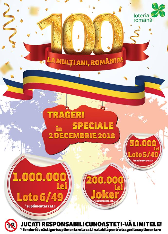 Loteria Romana organizeaza duminica, 2 DECEMBRIE, TRAGERILE SPECIALE LOTO CENTENAR 1918-2018 – LA MULTI ANI, ROMANIA!