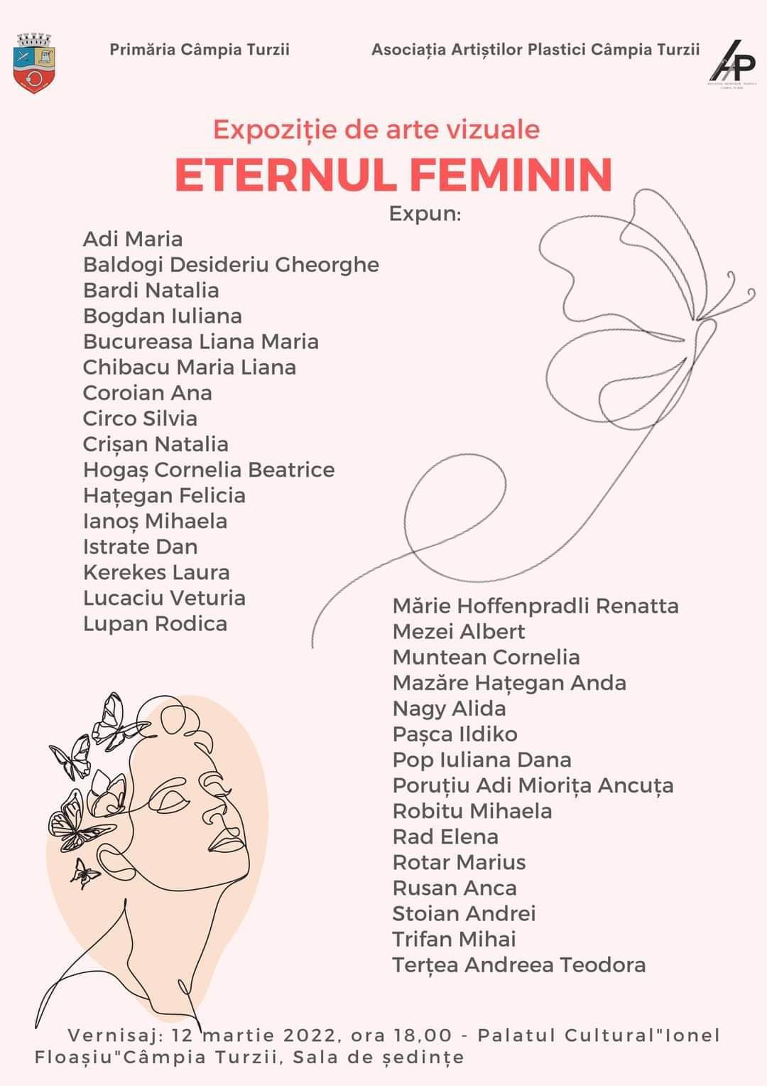 Va invitam cu drag la expozitia colectiva de arte plastice ,,Eternul feminin”, care va avea loc la Palatul Cultural ,,Ionel Floasiu” Campia Turzii, in data de 12 martie 2022, de la ora 18.